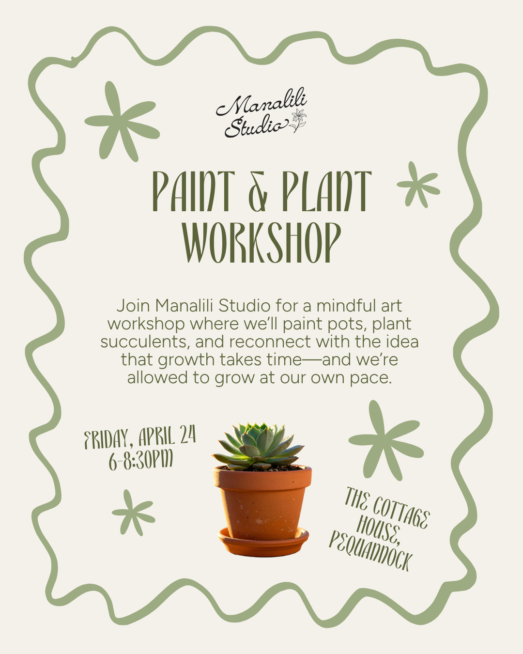 Join Manalili Studio for a cozy, mindful art workshop at The Cottage House in Pequannock, where we’ll reflect on the idea of “keep going, keep growing”—embracing the quiet, steady growth happening within us during this season of renewal.